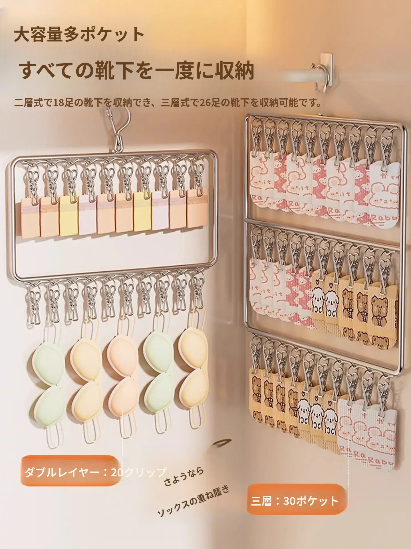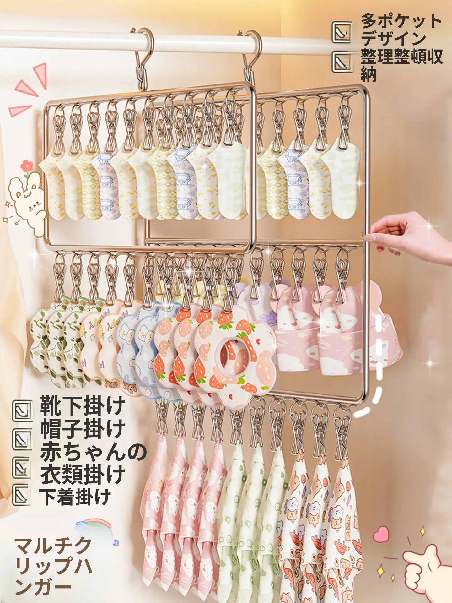多機能子供用ハンガー|赤ちゃんの服や靴下を一挙に収納!省スペース&便利な家庭用衣装棚で、整理整頓も簡単!おしゃれでかわいいデザインが魅力の収納アイテムです。