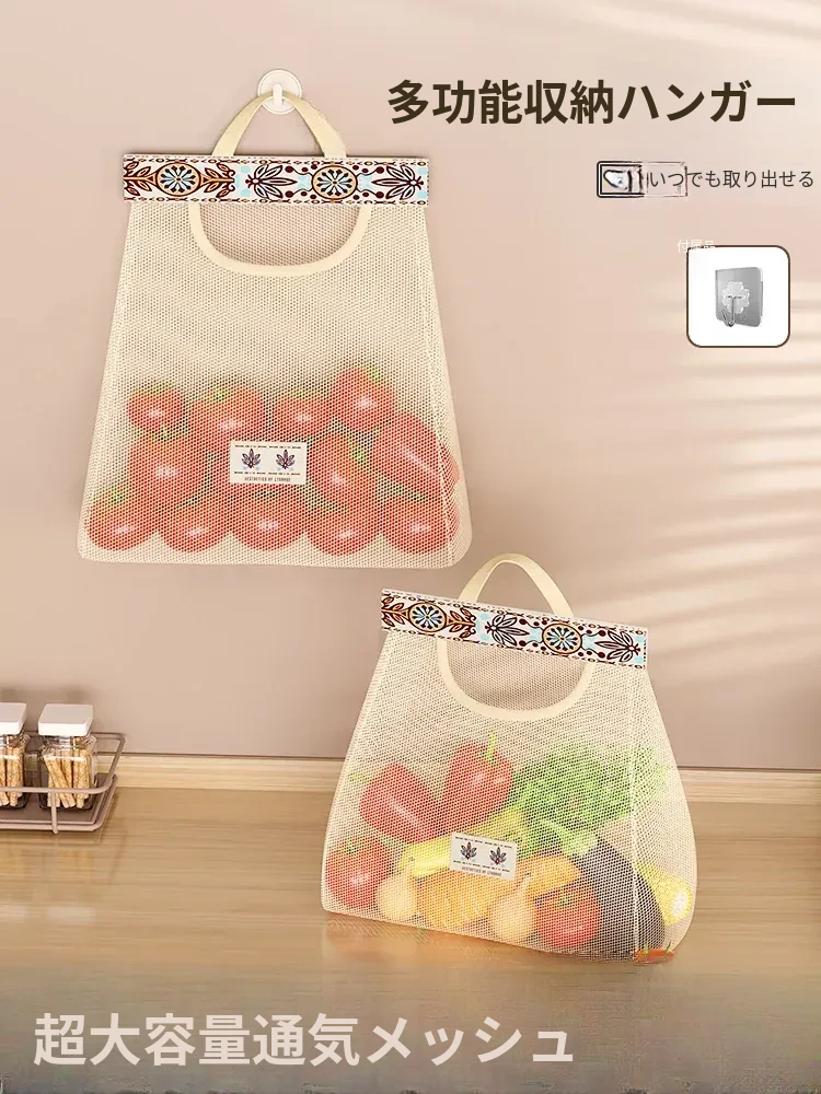 キッチン用野菜収納ネットバッグ - 壁掛け式ニンニク・生姜収納袋!スペースを有効活用し、整理整頓を簡単に。新鮮な食材を美しく保管し、料理の楽しさをアップ!