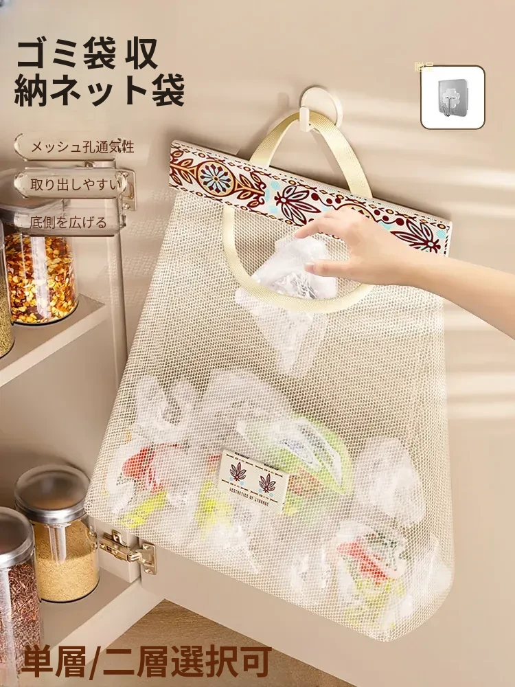 キッチンゴミ袋収納の必需品!壁掛け式クローゼットドア後ろの収納ポケットで、プラスチックバッグをすっきり整理。スペースを有効活用し、使いやすさ抜群のネットポーチ!